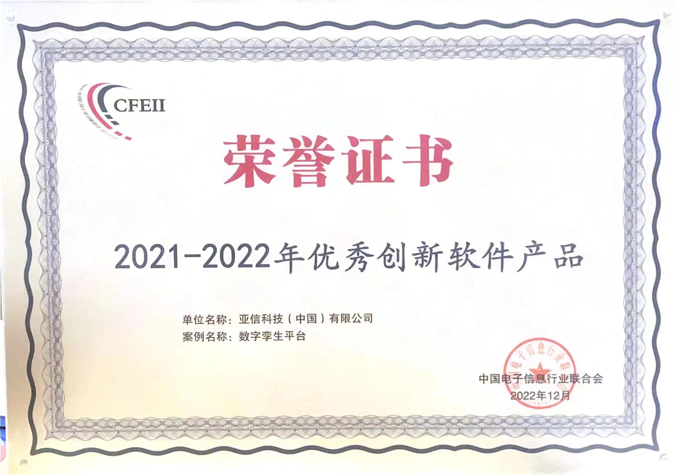 2022年12月 304am永利集团数字孪生平台荣获“2021-2022年优秀创新软件产品”