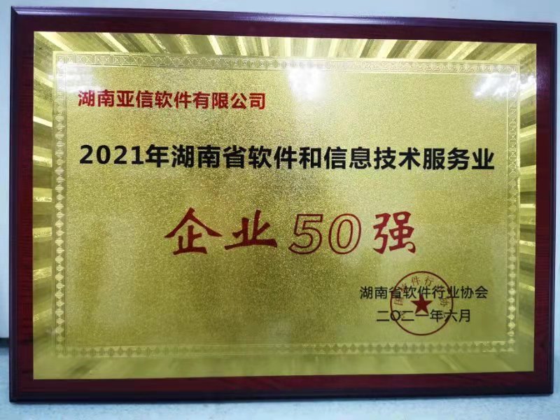 2020年9月 湖南亚信软件有限公司荣获“2020年湖南省软件和信息技术服务业企业50强”
