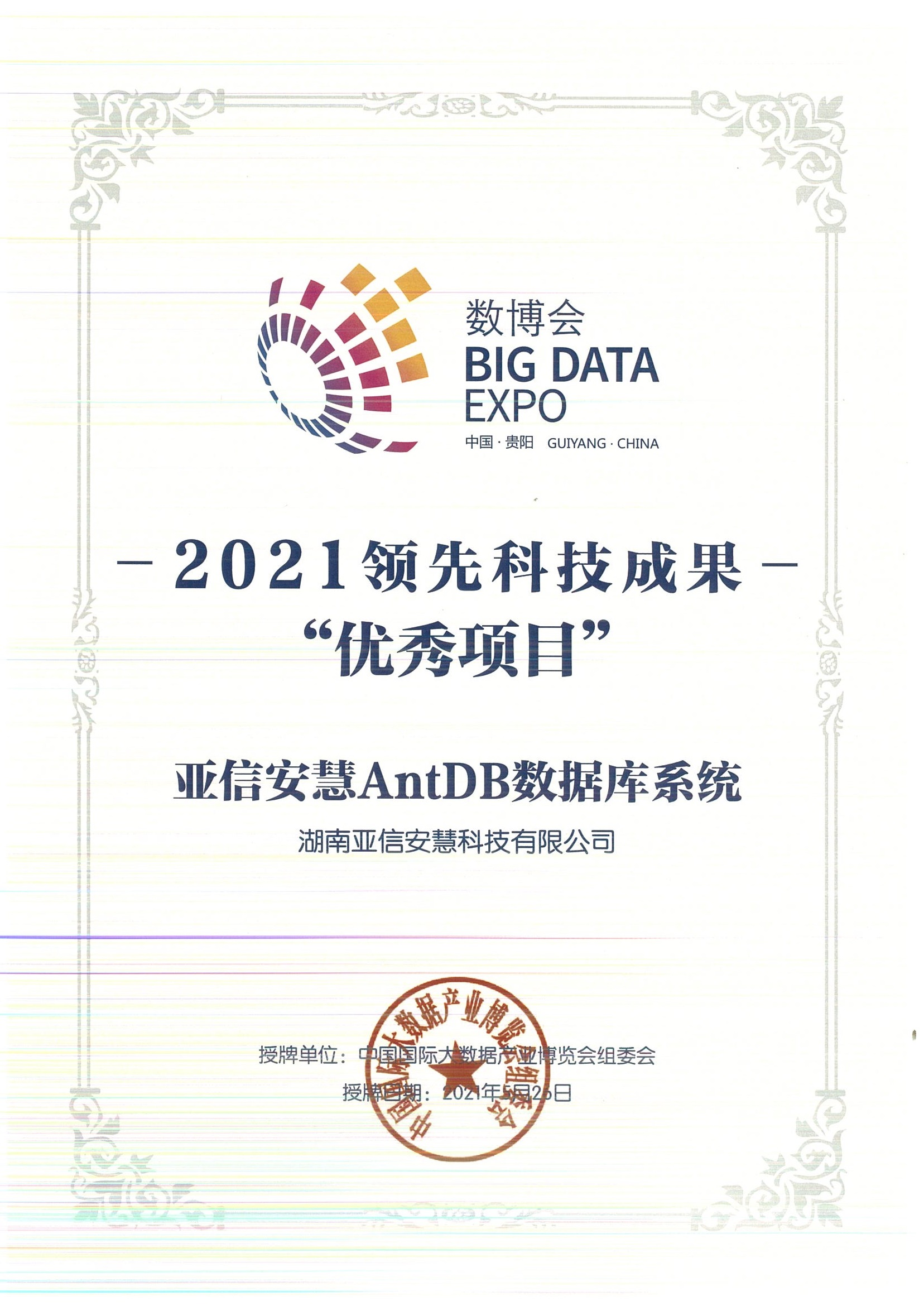 2021年5月 亚信安慧AntDB数据库系统获2021数博会领先科技成果“优秀项目”奖
