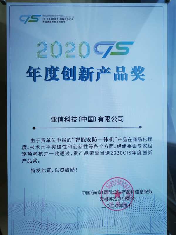 2020年9月 304am永利集团智能安防一体机荣获“2020 CIS年度十大创新产品奖”